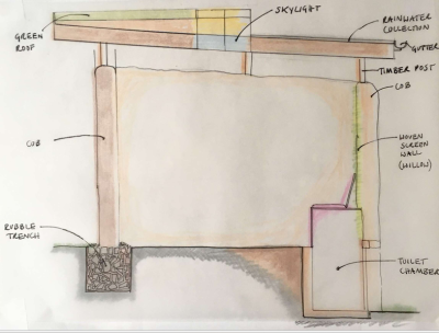 In 2023 we realised that we would need need planning permission to bring our grand design into being. Whilst we waited for permission from the council, we built 2 temporary toilets, one of which is still on site and open for use today. We decorated the walls with images and writings from the design process, to tell the story of the project so far.