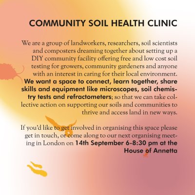 We are part of a collective that has been working together to establish a community soil clinic, offering free and low cost soil testing for growers, community gardeners and anyone with an interest in caring for their local environment. The soil clinic will hopefully one day offer a drop in space to connect, share skills, learn together about soil health, and make use of specialist equipment like microscopes and soil chemistry tests.