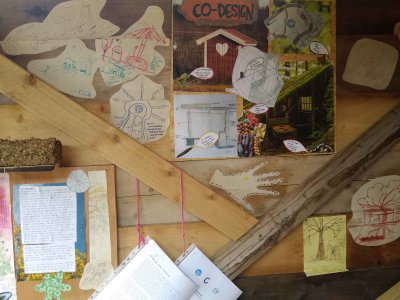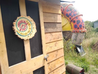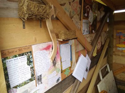 In 2023 we realised that we would need need planning permission to bring our grand design into being. Whilst we waited for permission from the council, we built 2 temporary toilets, one of which is still on site and open for use today. We decorated the walls with images and writings from the design process, to tell the story of the project so far.